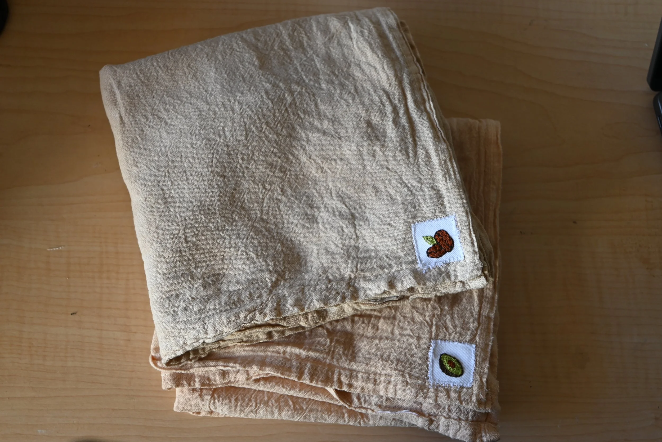 Kitchen towels dyed with natural dyes and hand embroidered, 2023